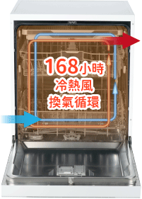 熱風及冷風交替換氣循環。藉由帶入新鮮空氣,同時抽出內部濕空氣,達到不產生異味,碗盤儲放保持乾燥不反潮